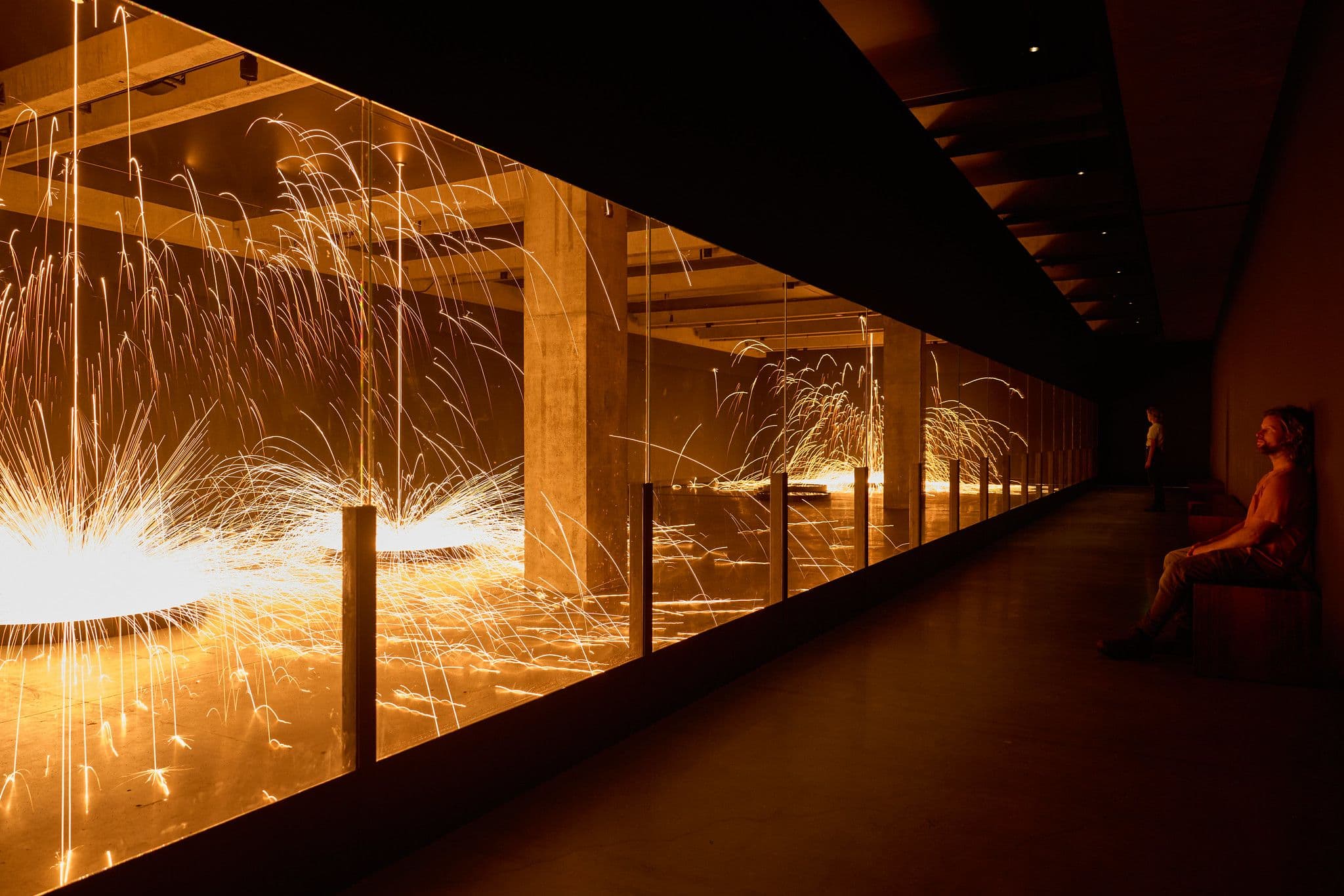 As you move through the exhibition, you will see various industrial materials put through their paces. Working through a great pile of wooden beams, a hydraulic piston methodically forces each piece to splinter and break. A suspended sheet of glass bows under the weight of a boulder, alongside a truck tyre squeezed and distorted under immense pressure. Twin metal discs, coated in thick industrial oil, spin slowly while gravity does its work. And, from the ceiling of one entire gallery, steel heated to 1500°C showers down as liquid metal and firelight in the darkness. ‘When steel melts, its energy becomes light,’ Sassolino explains. At the Venice Biennale in 2022 he used fiery droplets of molten steel to evoke the dramatic chiaroscuro of Caravaggio’s seventeenth-century paintings, specifically the brutal Beheading of Saint John the Baptist. There was darkness, then light, then darkness returned. But here and now, Sassolino seems to look more to the future than the past, playing with fire as a destructive and regenerative force in our rapidly changing world.